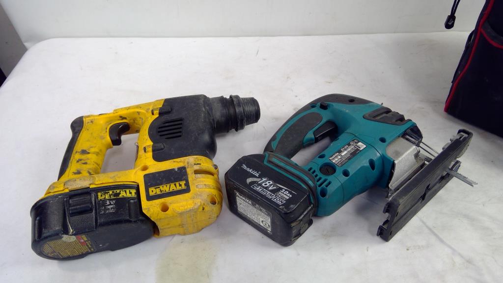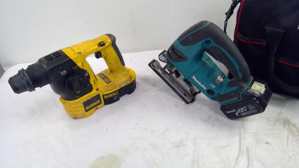Dewalt 18V SDS Hammer, And Makita Jigsaw, With Husky Tool Bag, 3 Pieces