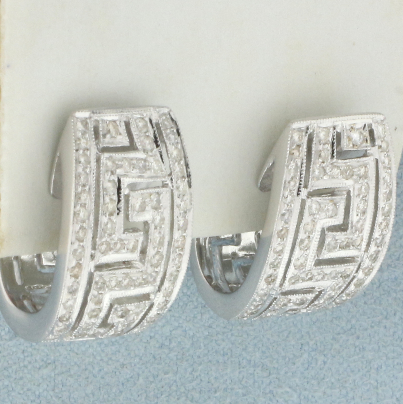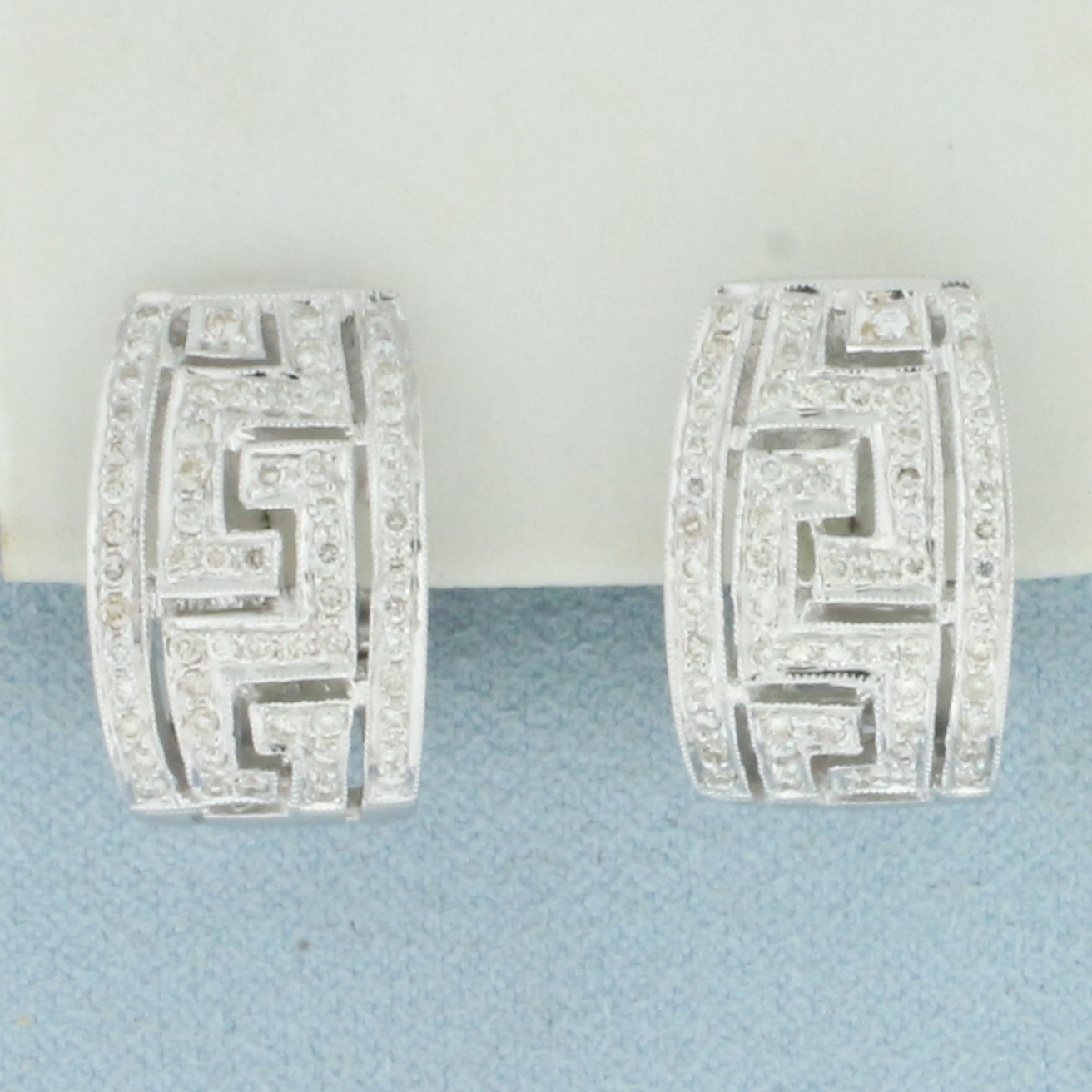 In 18k white gold. 3/4 inches long by 3/8 inches wide. Contains 120 high quality diamonds, 1ct TW, VS clarity/G color. Pave set into Greek Key Design. Omega post backs for pierced ears with locking lever.