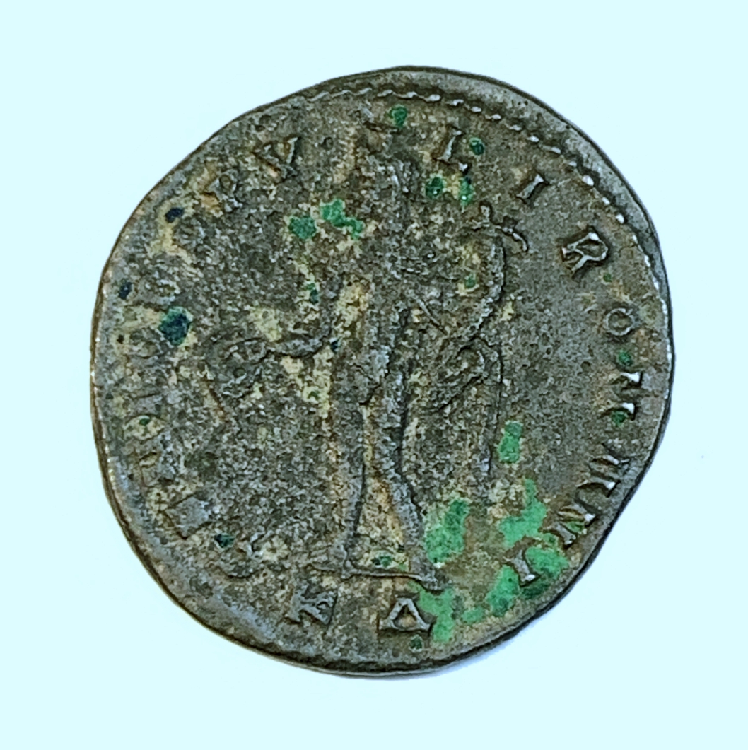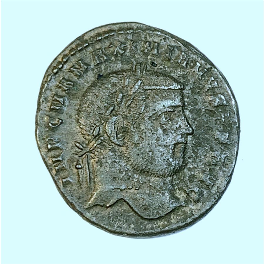 Roman Imperial Galerius Maximianus AE Follis (Bronze, 25mm, 6.30g) 308-309 Obv: IMP C GAL VAL MAXIMIANVS PF AVG, laureate head right Rev: GENIO IMP-ERATORIS, Genius standing left, modius on head, naked except for chlamys over left shoulder (falls low), holding patera from which liquid flows, and cornucopiae