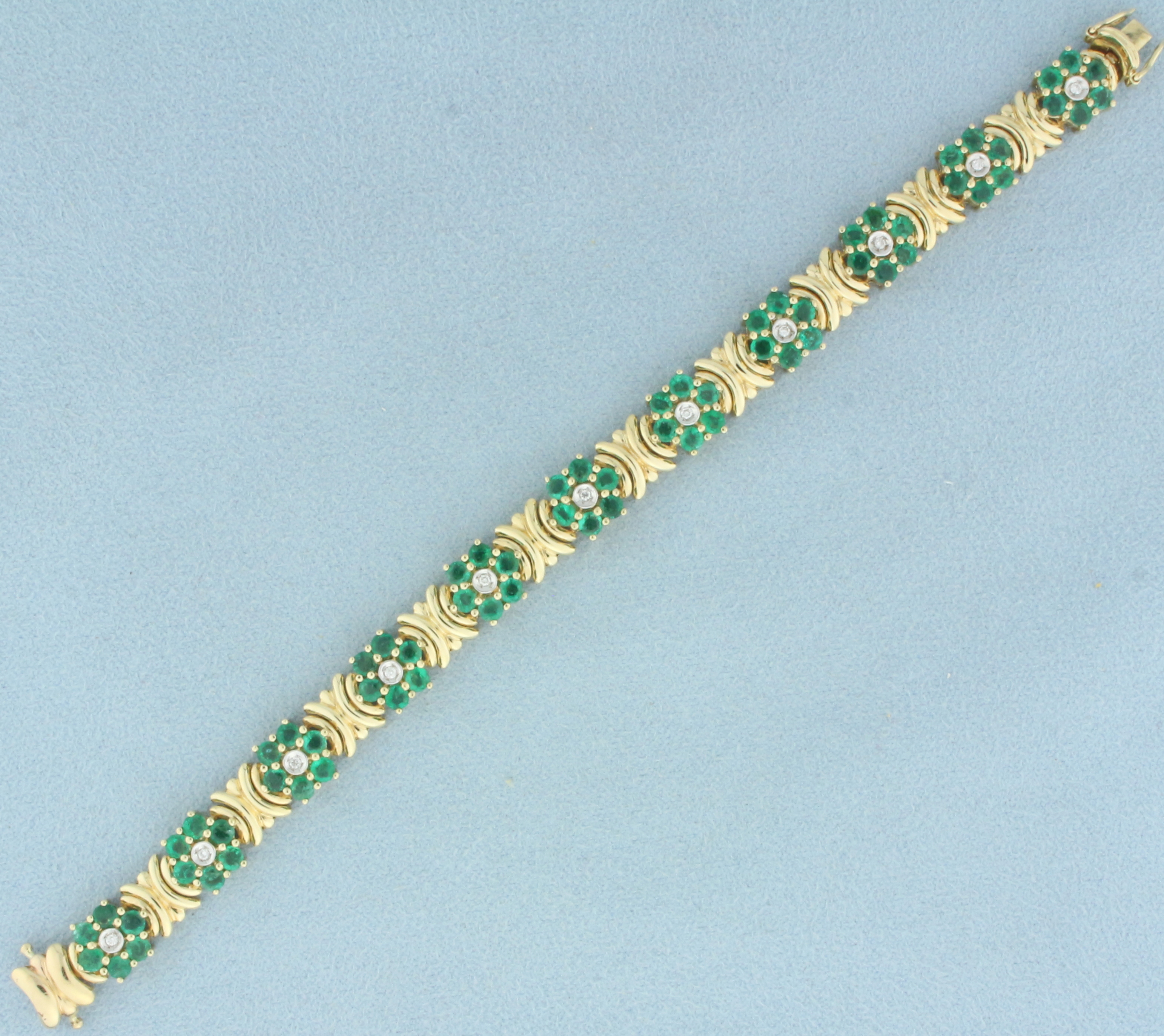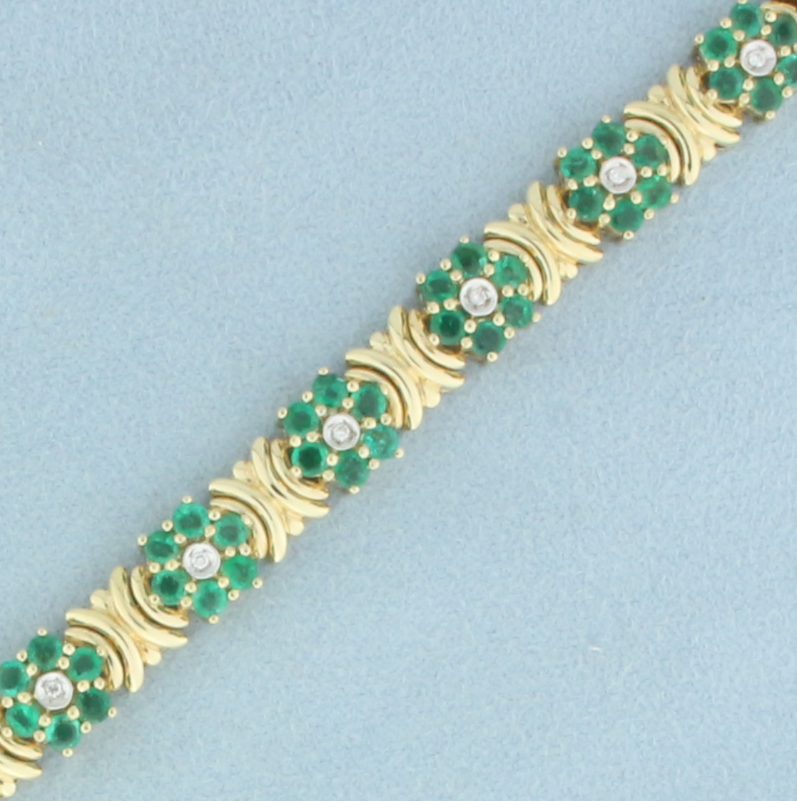 Emerald and Diamond Flower Design Bracelet in 14k Yellow Gold