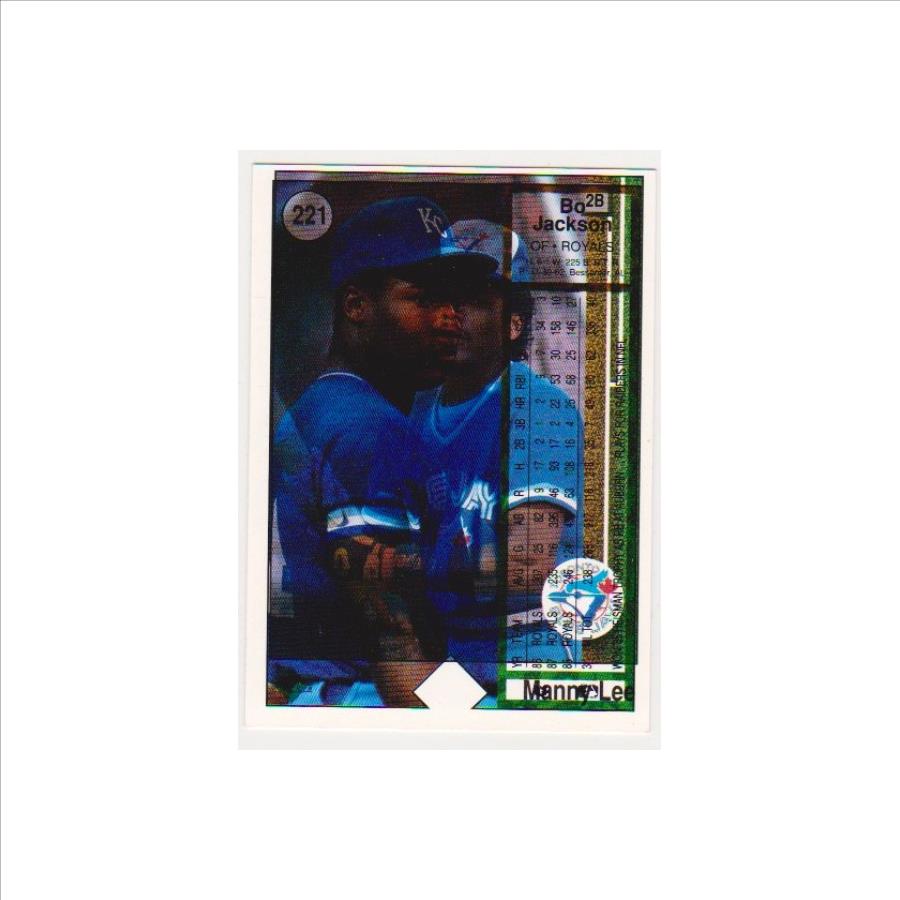 This is a 1989 Upper Deck Bo Jackson card with a very unusual error.  It has a normal Bo Jackson front. However, it has a double printed back with the normal Jackson back plus a Manny Lee back so everything is scrambled.  Normally errors like this are destroyed at the factory making them very tough to find in packs.  It has minor wear and is off center, but is in approximately Excellent overall condition.  This is a neat looking error card of this retired baseball All-Star.
