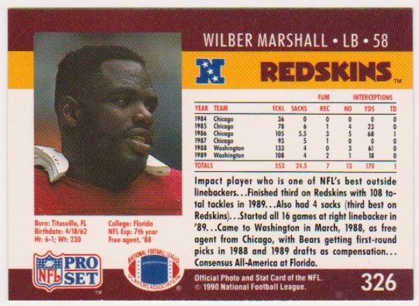 This is a 1990 Pro Set Joe Montana error card.  This card has a correct front but has a Wilber Marshall #326 back. It is in approximately Near Mint condition.