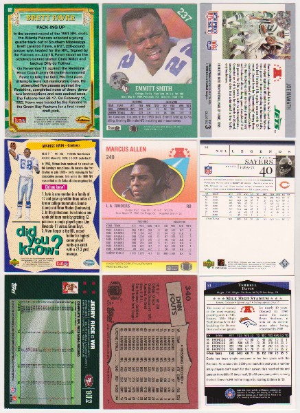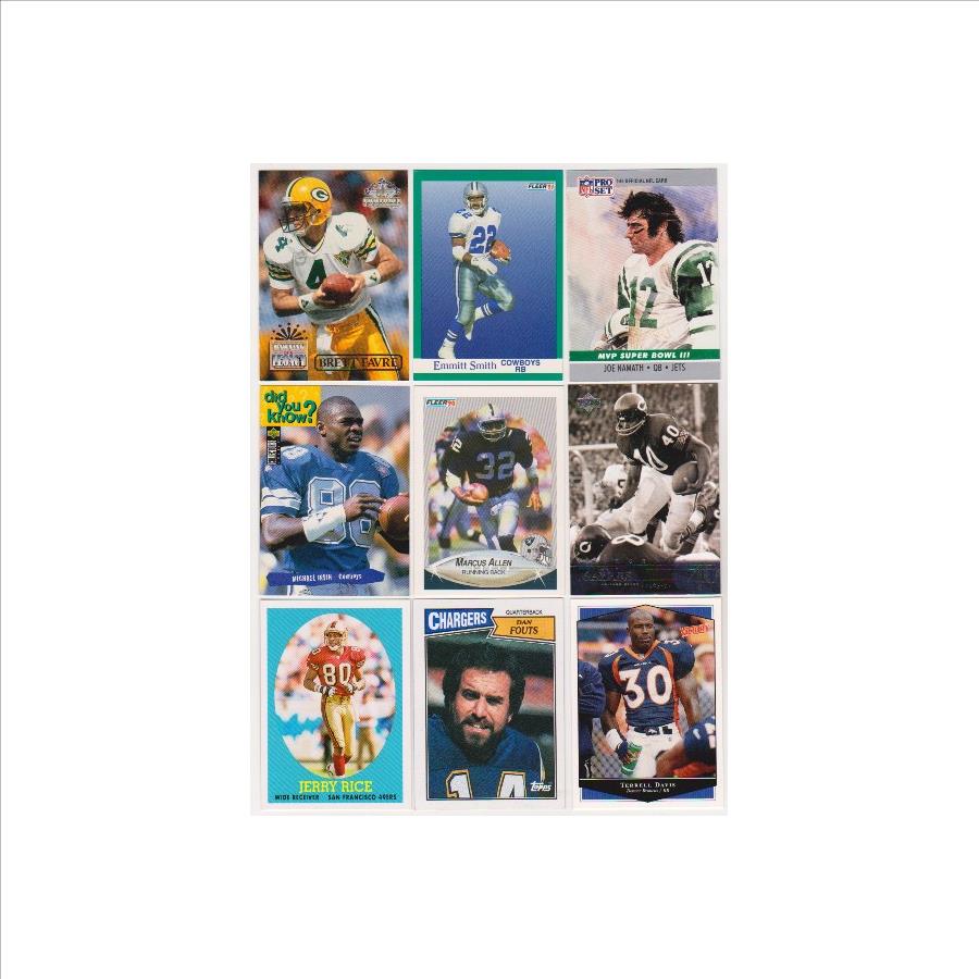 This is a collection of 9 different football cards of star and Hall of Fame players.  These range from 1987-2007.  This lot includes Brett Favre, Emmitt Smith, Joe Namath, Gale Sayers, Marcus Allen, Michael Irvin, Terrell Davis, Dan Fouts, and Jerry Rice.   These are mostly in the EX-MT to Near Mint condition range.  This is a nice lot featuring a great mix of stars.