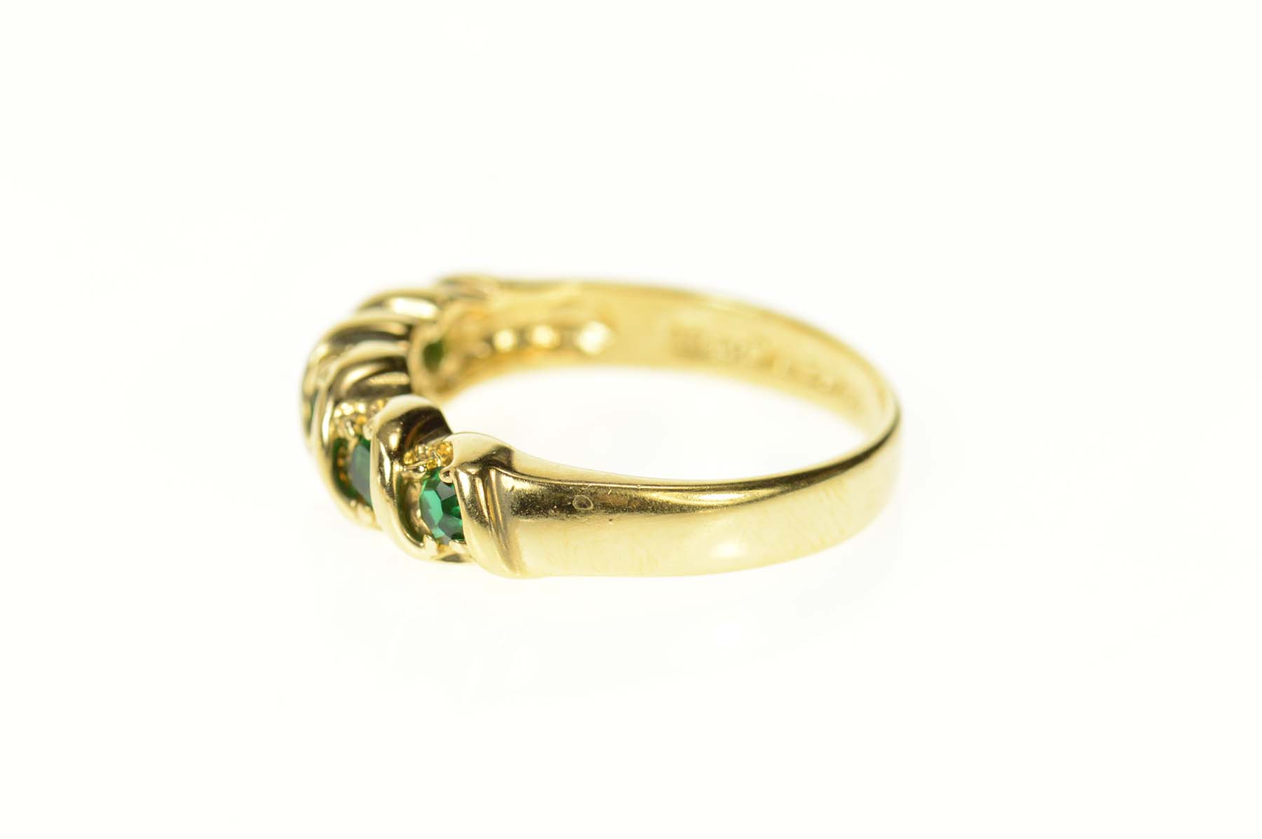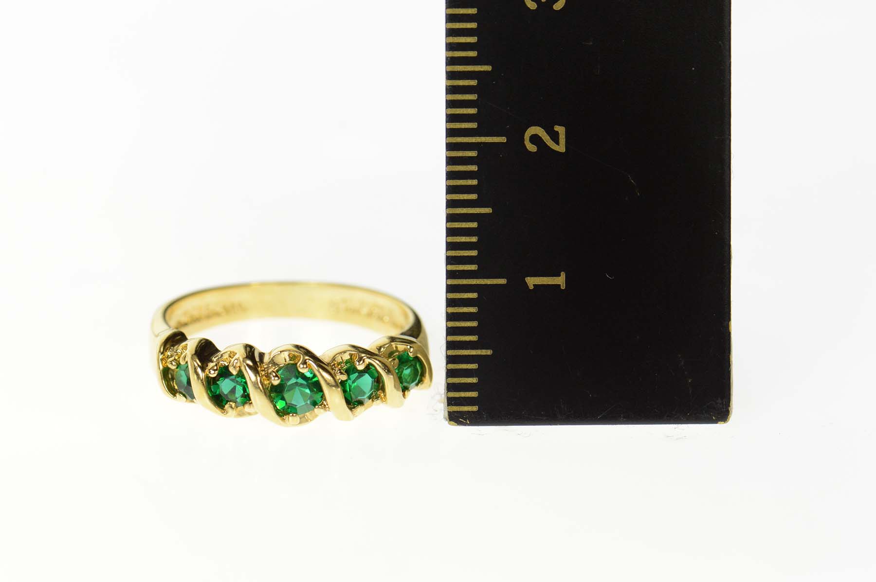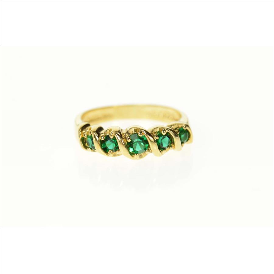 Item:  Gold Plated Five Stone Retro Syn. Emerald Band Ring, Size 7