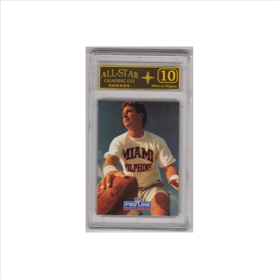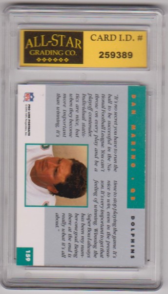 This is a Dan Marino 1991 Pro Line #159 card that has been graded a Mint or Higher 10 by ASG.  The holder has some surface wear/scuffs, but overall this is a nice graded card of this NFL Hall Of Famer.