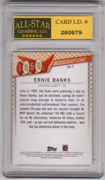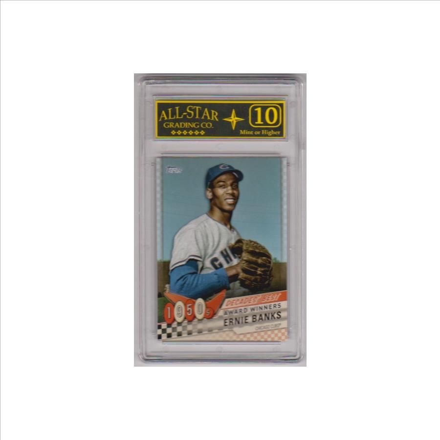 This is a Ernie Banks 2020 Topps Decades' Best #DB-3 insert card that has been graded a Mint or Higher 10 by ASG.  The holder has some light surface wear, but overall this is a nice graded card of this baseball Hall Of Famer.