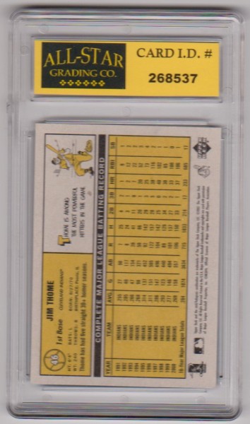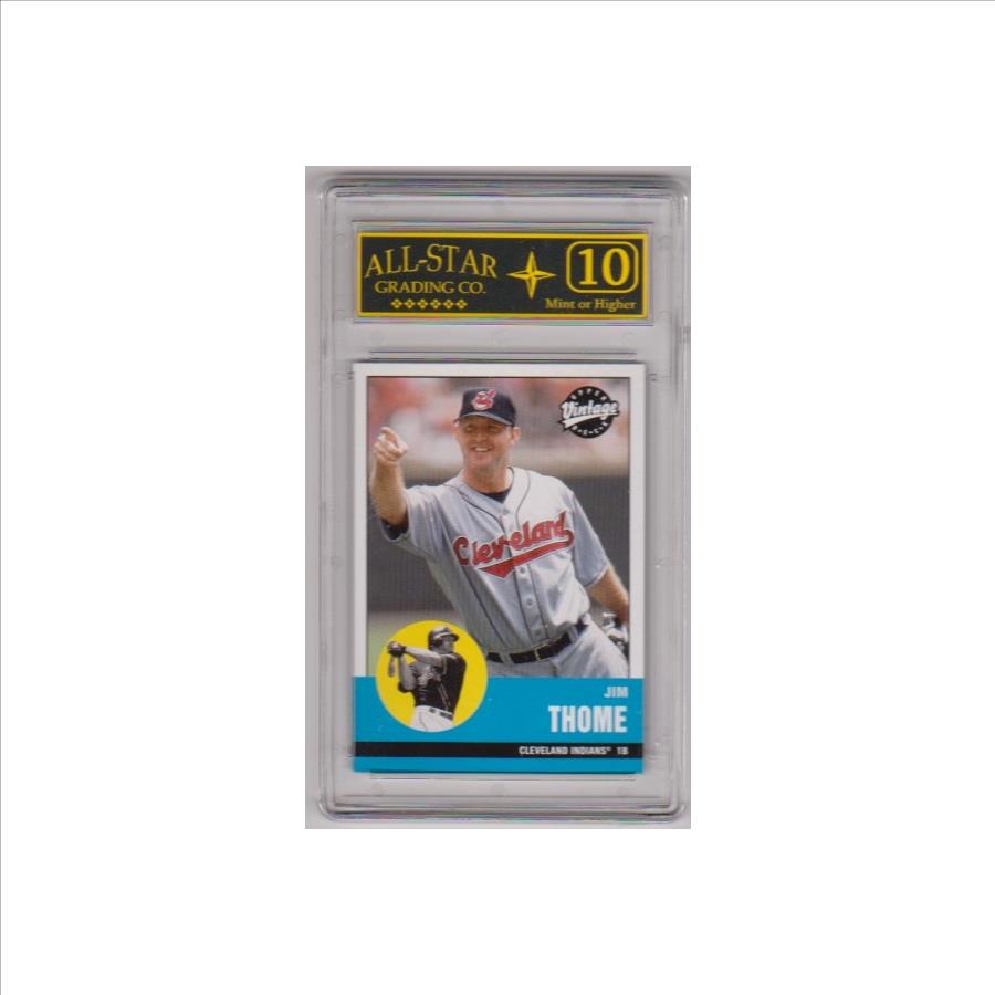 This is a Jim Thome 2001 Upper Deck Vintage #46 card that has been graded a Mint or Higher 10 by ASG.  The holder has some light surface wear/scuffs, but overall this is a nice graded card of this baseball Hall of Famer.