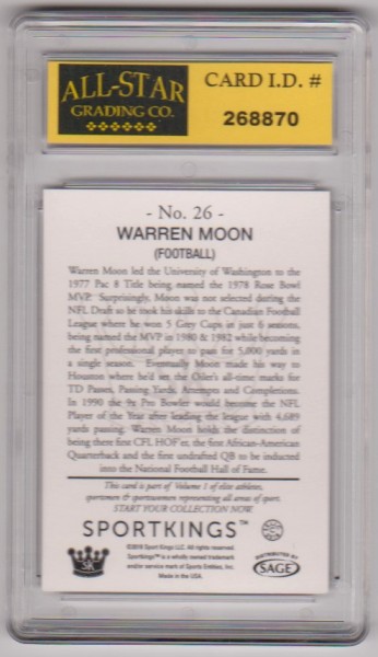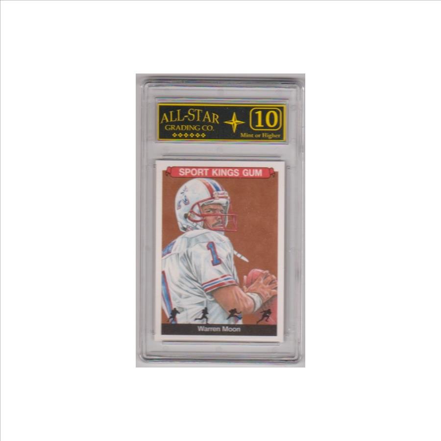 This is a Warren Moon 2018 Sage Sport Kings Gum #26 card that has been graded a Mint or Higher 10 by ASG.  The holder has some light surface wear, but overall this is a nice graded card of this NFL Hall Of Famer.