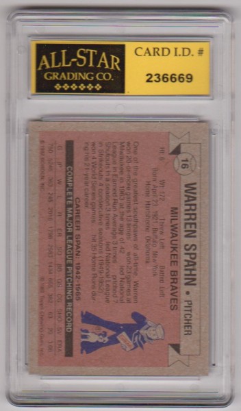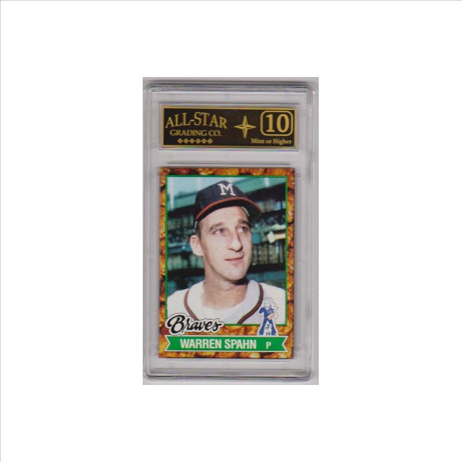 This is a Warren Spahn 1982 Topps Cracker Jack #16 card that has been graded an Mint or Higher 10 by ASG.  The holder has some minor surface wear, but overall this is a nice graded card of this baseball Hall of Famer.