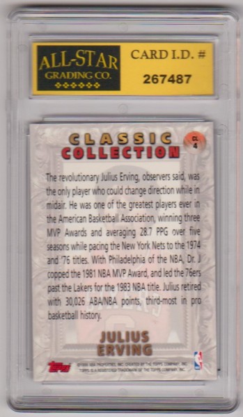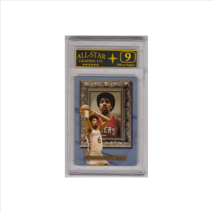 This is a Julius Erving 1998-99 Topps Classic Collection #CL4 Insert card that has been graded a NM or higher 9 by ASG.  The holder has some light surface wear, but overall this is a nice graded card of this NBA Hall of Famer.