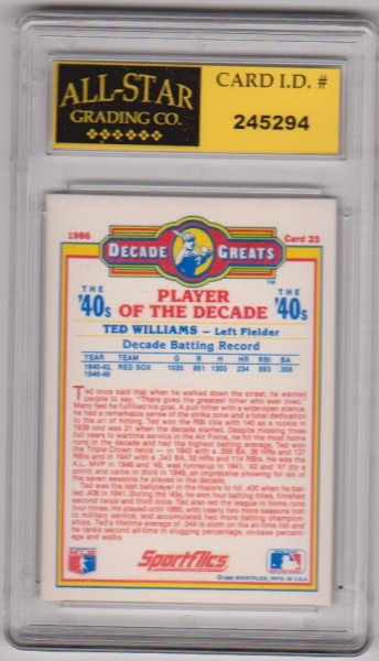 This is a Ted Williams 1986 Sportflics Decade Greats #25 card that has been graded a NM or higher 9 by ASG.  The holder has some light surface wear, but overall this is a nice graded card of this baseball Hall of Famer.