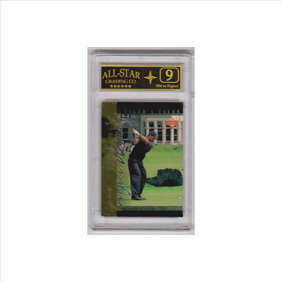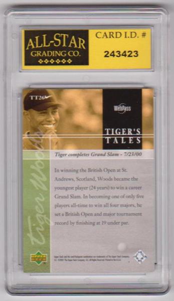 This is a 2001 Upper Deck Tiger's Tales Tiger Woods #TT26 insert card that has been graded a 9 by ASG.  The holder has some minor surface wear, but overall this is a nice graded card of this golfing great.