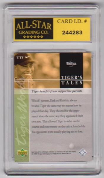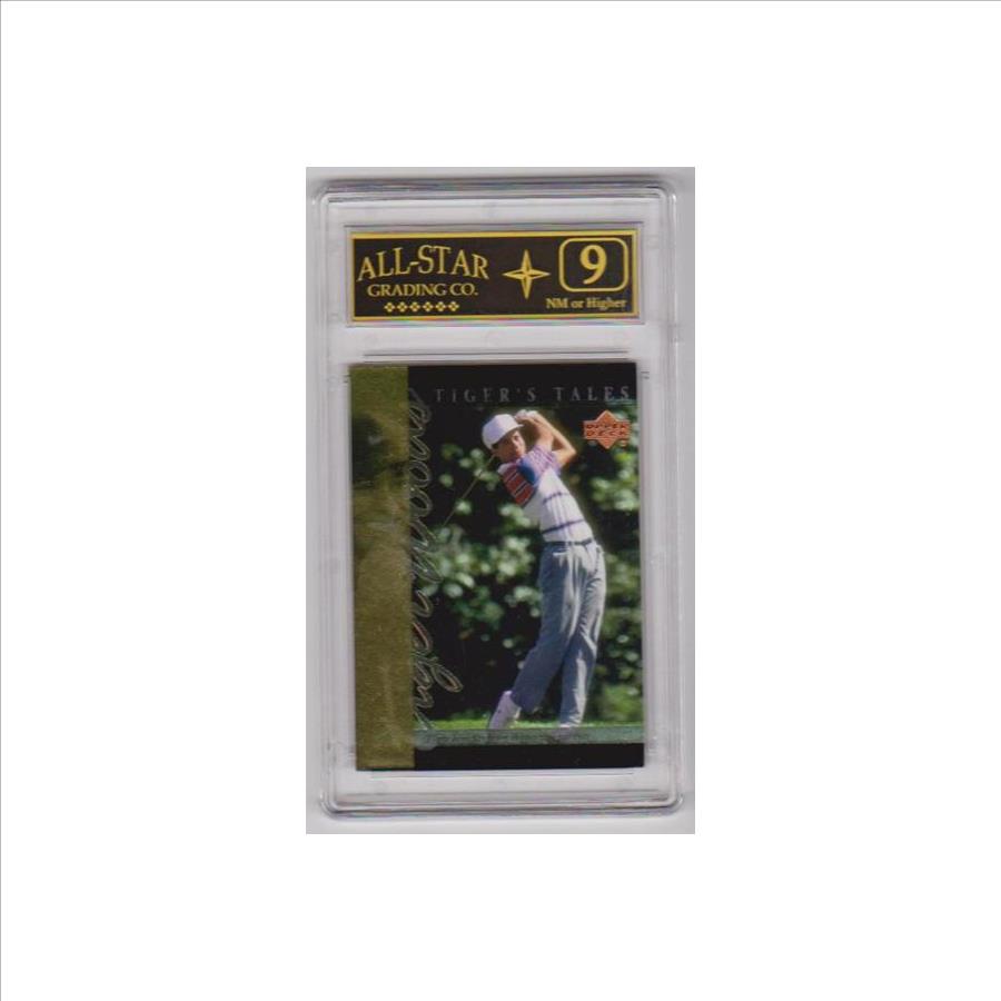 This is a Tiger Woods 2001 Upper Deck Tiger's Tales #TT5 insert card that has been graded a NM or Higher 9 by ASG.  This is a nice graded card of this legendary golfer.