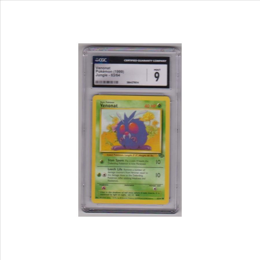 This is a Venonat 1999 Pokemon Jungle #63/64  card that has been graded a Mint 9 by CGC.  The holder has some minor surface wear, but overall this is a sharp graded vintage Pokemon card.