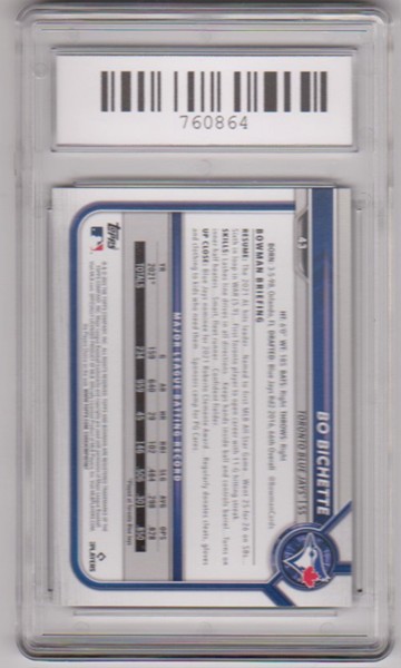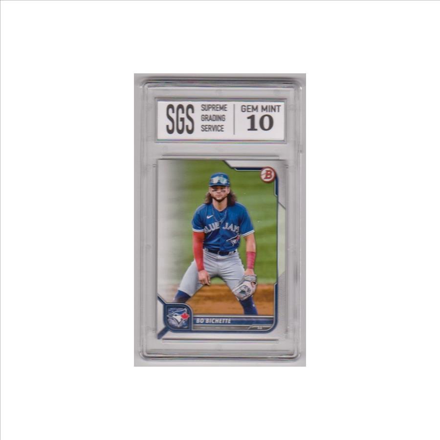 This is a 2022 Bowman Bo Bichette #43 card that has been graded a Gem Mint 10 by SGS.  This is a sharp graded card of this baseball star.
