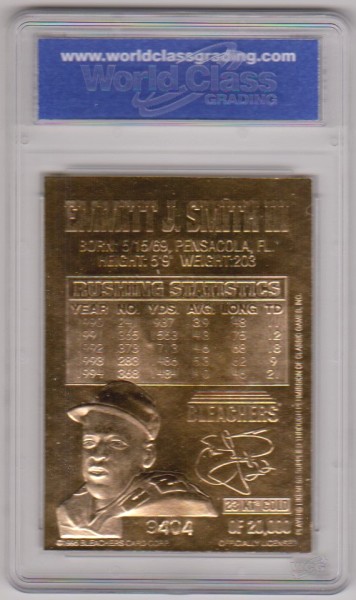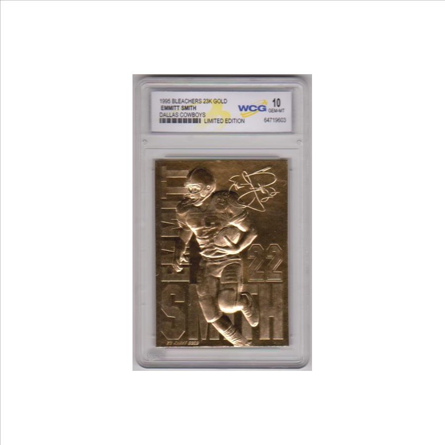 This is a 1995 Bleachers Emmitt Smith 23 Kt Gold card that has been graded a Gem Mint 10 by WCG.  The holder has some light surface scuffs on the front, but overall this is a sharp graded card of this NFL Hall of Famer.