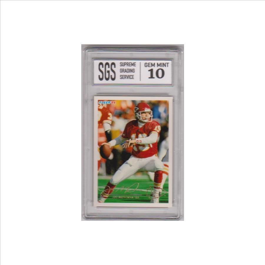 This is a Joe Montana 1994 Fleer #226 card that has been graded a Gem Mint 10 by SGS. This is a great looking graded card of this NFL Hall of Famer.