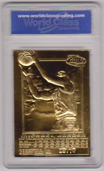 This is a 1996-97 Skybox EX-2000 Credentials Metallic Red Border Signature Series 23 Kt Gold Michael Jordan card that has been graded a Gem Mint 10 by WCG.  The holder has some light surface wear, but overall this is a sharp graded 23 Karat Gold card of this NBA Hall of Famer.