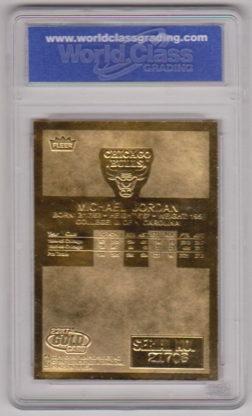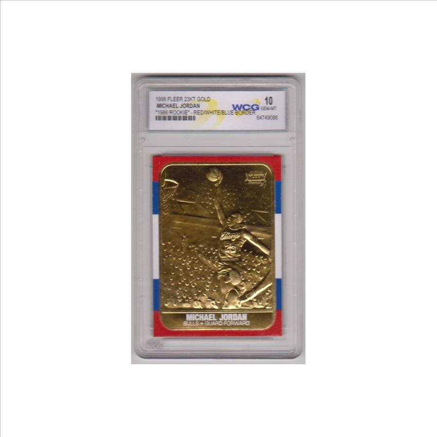 This is a 1998 Fleer 1986 Rookie Style Red/White/Blue Border 23 Kt Gold Michael Jordan card that has been graded a Gem Mint 10 by WCG.  The holder has a couple of small light surface scuffs on the front, but overall this is a sharp graded 23 Karat Gold card of this NBA Hall of Famer.