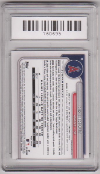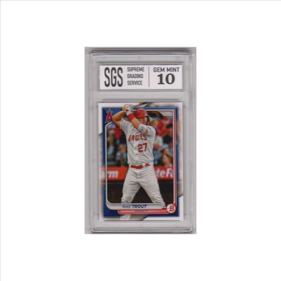 This is a Mike Trout 2024 Bowman #19 card that has been graded a Gem Mint 10 by SGS.  This is a sharp graded card of this baseball All-Star.