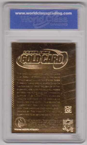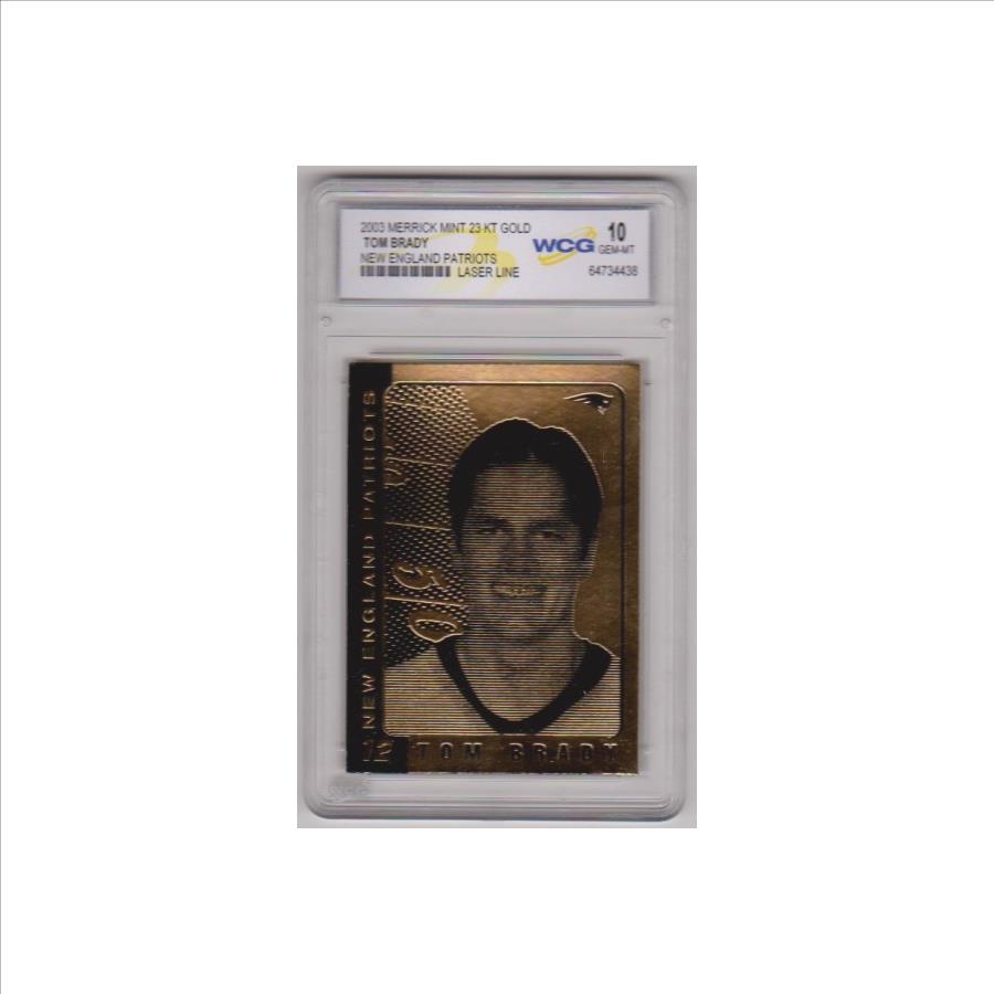 This is a 2003 Merrick Mint Laser Line Tom Brady 23 Kt Gold card that has been graded a Gem Mint 10 by WCG. There are a couple of light surface scuffs on the holder, but overall this is a sharp graded card of this future NFL Hall Of Famer.