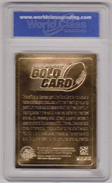 This is a 2005 Merrick Mint Tom Brady 23 Kt Gold card that has been graded a Gem Mint 10 by WCG.  The holder has a couple of small light surface scuffs, but overall this is a sharp graded card of this future NFL Hall Of Famer.