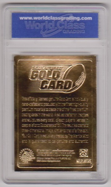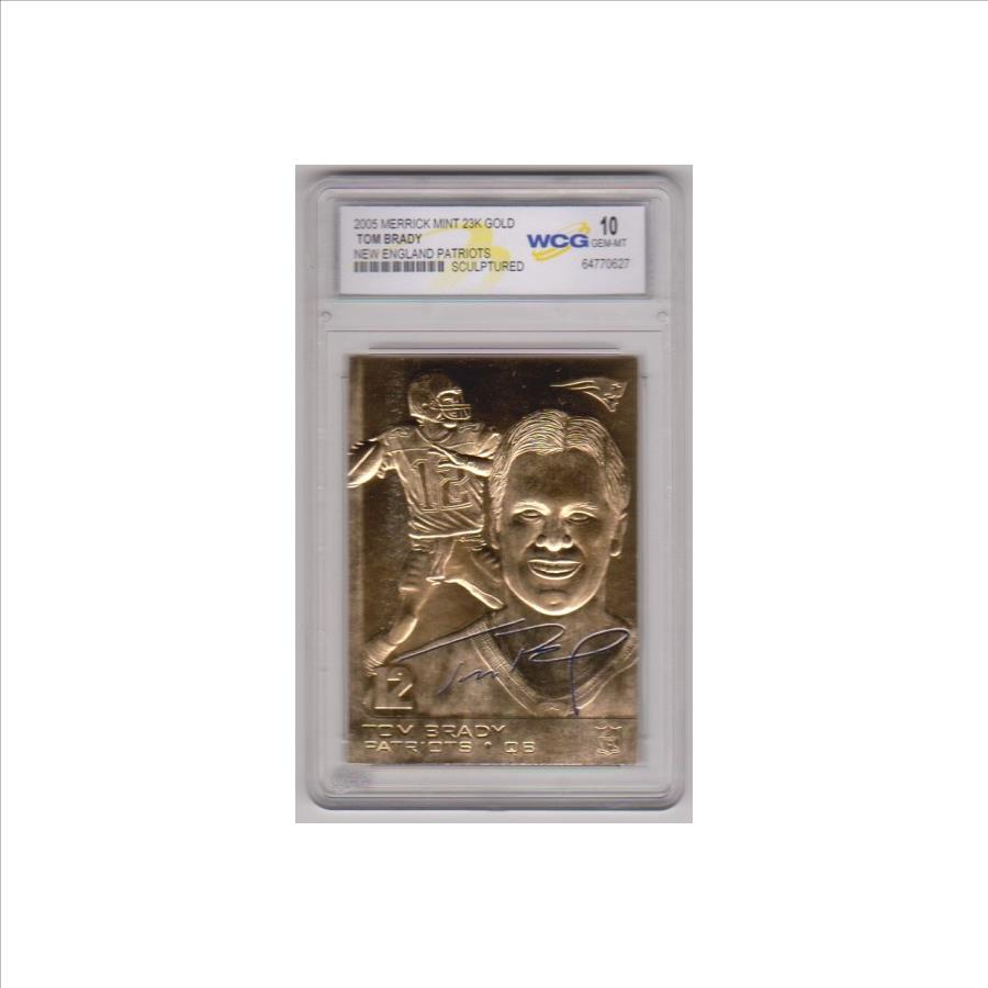 This is a 2005 Merrick Mint Tom Brady 23 Kt Gold card that has been graded a Gem Mint 10 by WCG.  The holder has some light surface wear, but overall this is a sharp graded card of this future NFL Hall Of Famer.