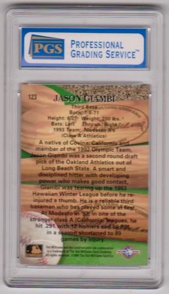 This is a 1994 Ted Williams Company Jason Giambi #123 minor league rookie card that has been graded a Mint 9 by PGS. The holder has some light surface wear, but overall this is a nice graded card featuring Giambi in his Modesto A's minor league uniform.