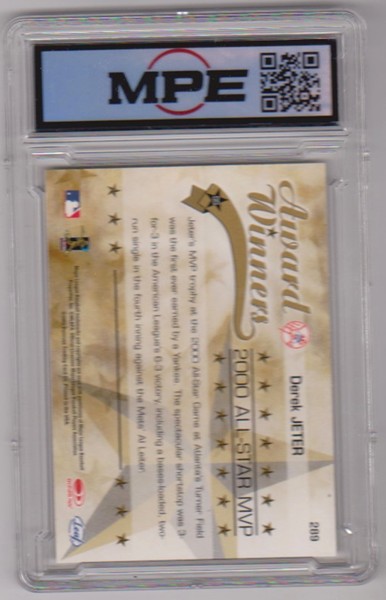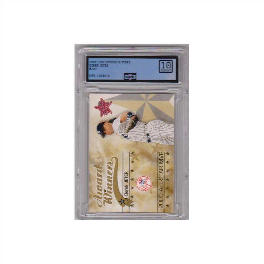 This is a 2002 Leaf Rookies & Stars Derek Jeter #289 card that has been graded a Gem Mint 10 by MPE.  The holder has some minor surface wear, but overall this is a sharp graded card of this baseball Hall of Famer.
