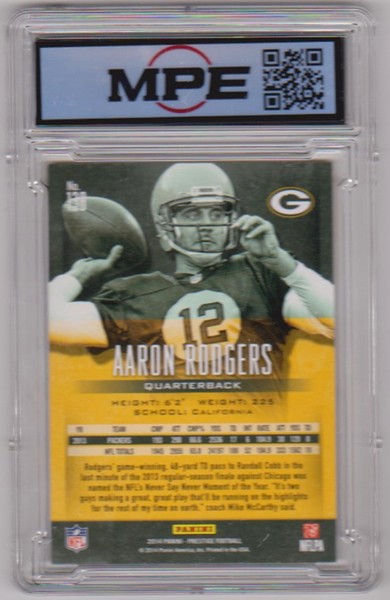 This is a 2014 Panini Prestige Aaron Rodgers #138 card that has been graded a Mint 9 by MPE.  The holder has some very minor surface wear, but overall this is a sharp graded card of this NFL star.
