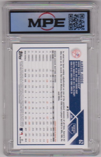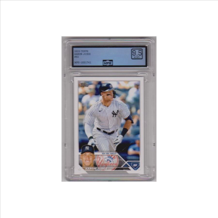 This is a Aaron Judge 2023 Topps #62 card that has been graded a Mint+ 9.5 by MPE.  The holder has some surface wear including a couple of scuffs, but overall this is a sharp graded card of this baseball star.
