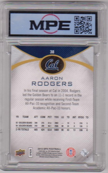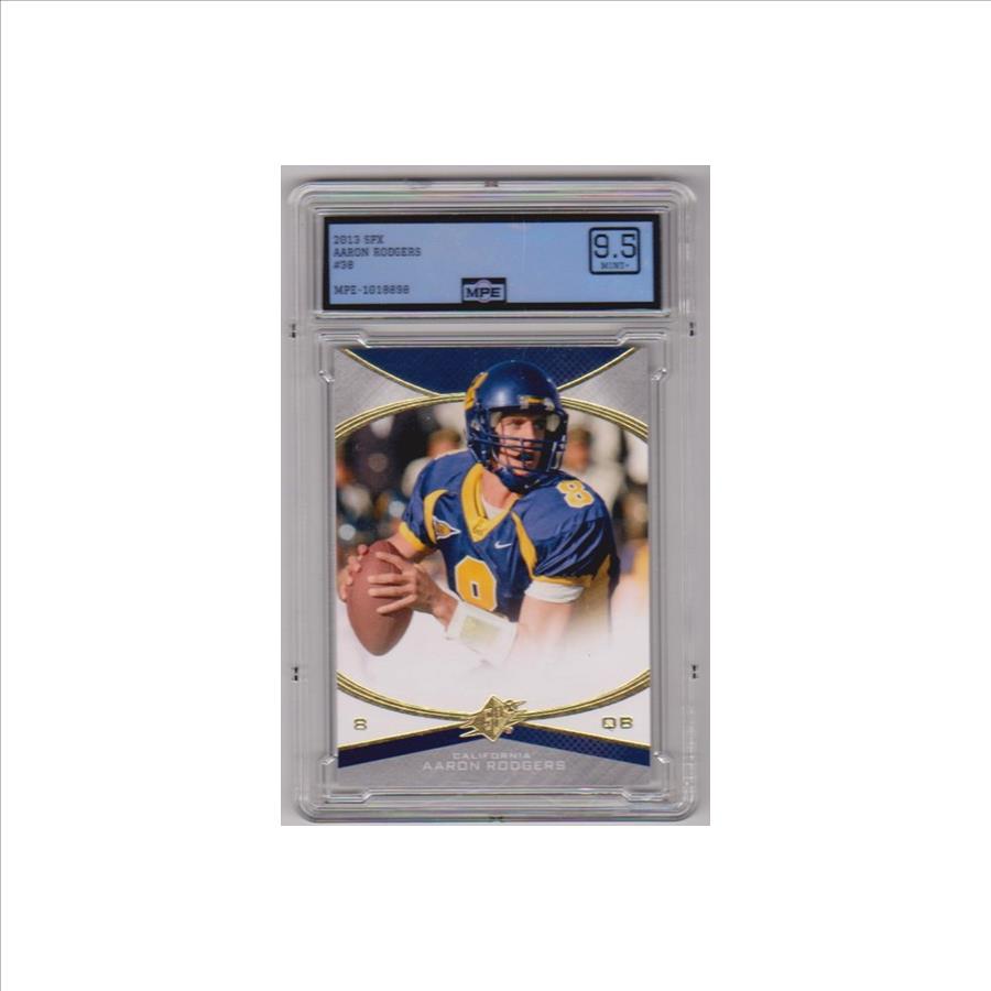 This is a 2013 Upper Deck SPx Aaron Rodgers #38 card that has been graded a Mint+ 9.5 by MPE.  The holder has some minor surface wear, but overall this is a nice graded card of this NFL star.
