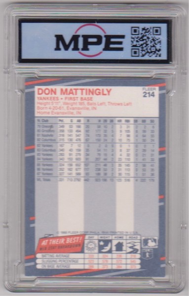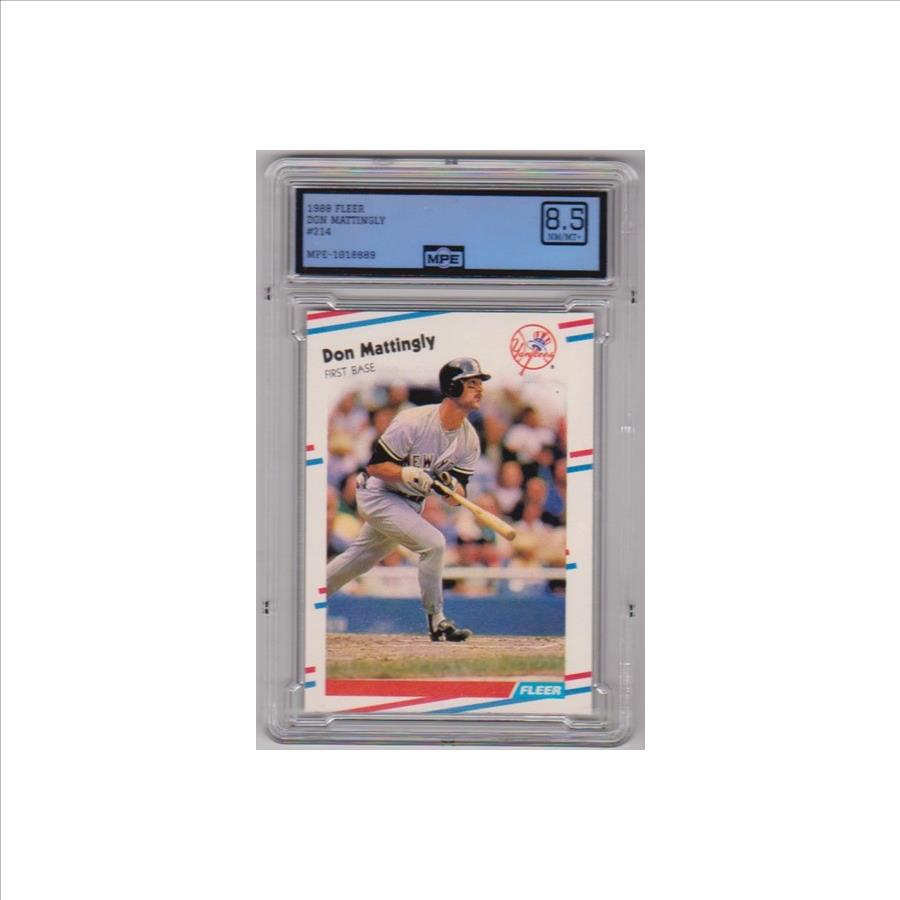 This is a 1988 Fleer Don Mattingly #214 card that has been graded a NM/MT+ 8.5 by MPE.  The holder has some minor surface wear, but overall this is a sharp graded Mattingly card.   Graded MPE NM/MT+ 8.5 - Don Mattingly 1988 Fleer #214 Card.
