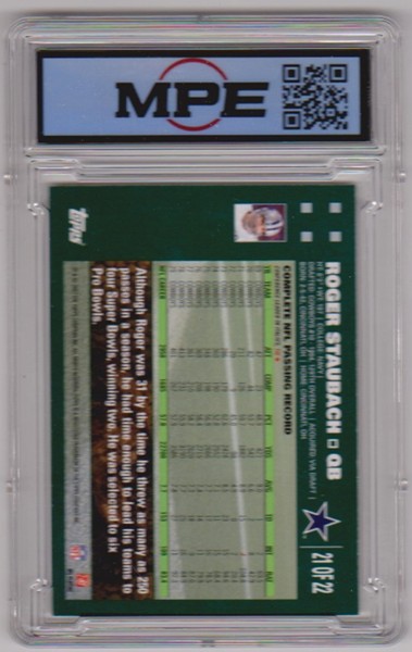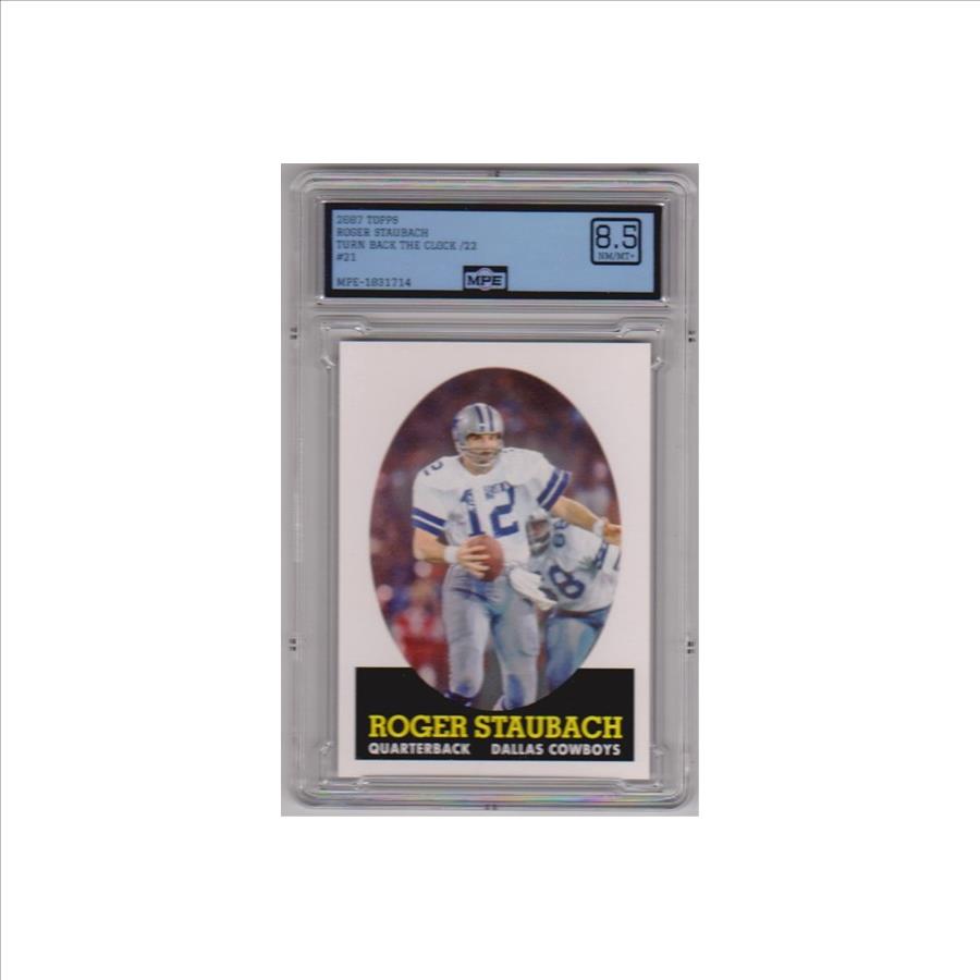 This is a 2007 Topps Turn Back The Clock Roger Staubach #21 card that has been graded a NM/MT+ 8.5 by MPE.  The holder has some minor surface wear, but overall this is a sharp graded card of this NFL Hall of Famer.