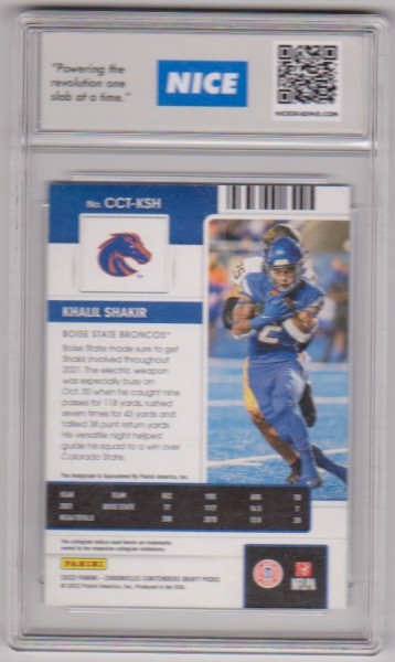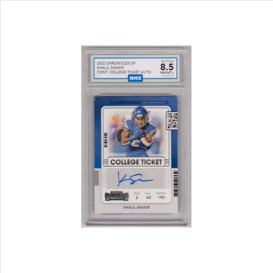 This is a Khalil Shakir 2022 Panini Chronicles Draft Picks College Ticket #CCT-KSH Certified Autographed insert card that has been graded a NM-MT+ 8.5 by Nice Grading. The card has the Panini autograph guarantee printed on the back. The holder has some surface wear, but overall this is a nice graded Shakir autographed card.