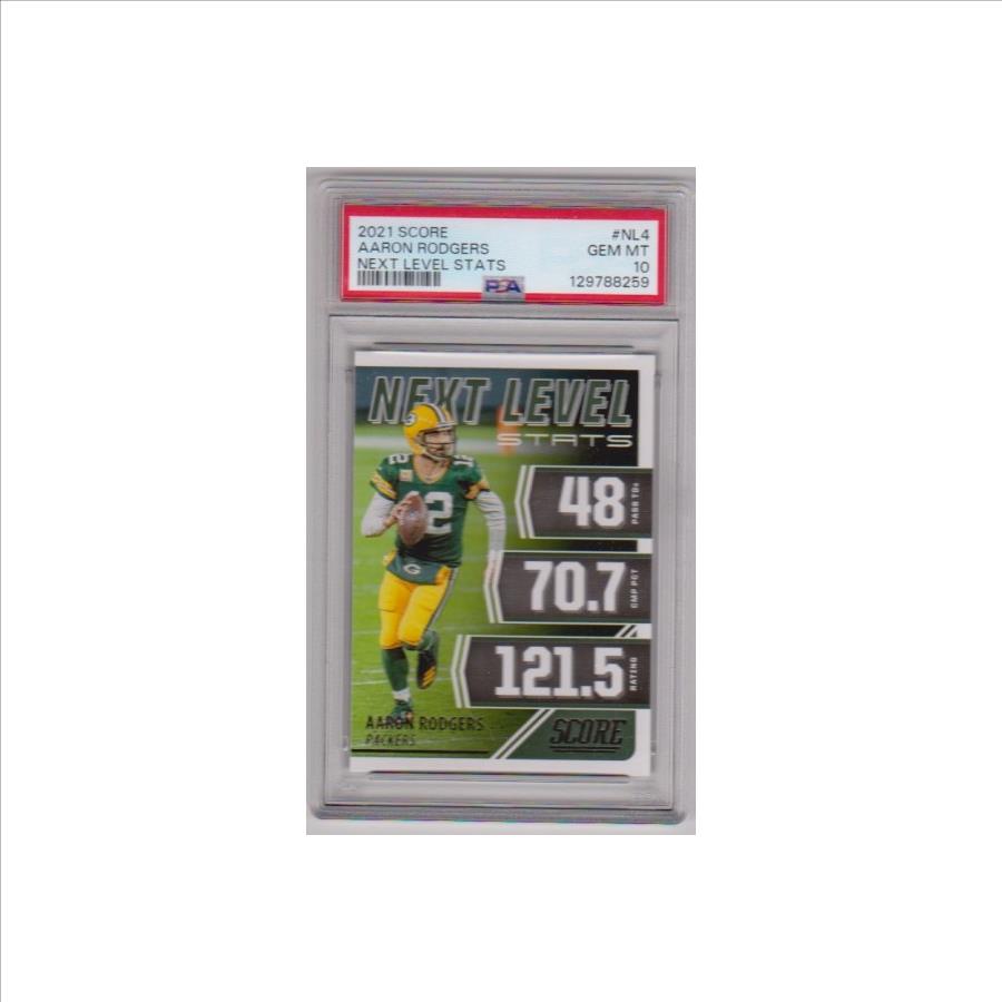 This is a Aaron Rodgers 2021 Score Next Level Stats #NL4 Insert card that has been graded PSA Gem Mint 10. This is a sharp PSA graded card of this NFL star.