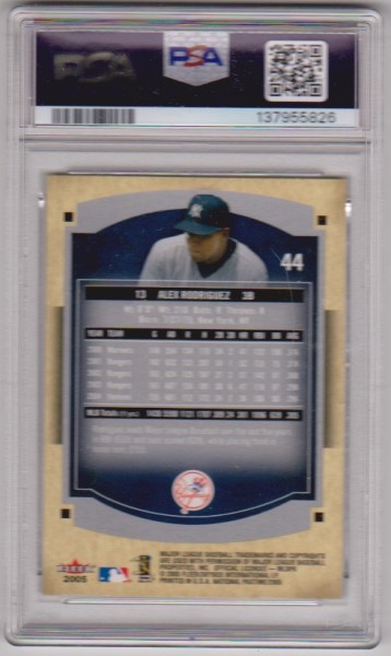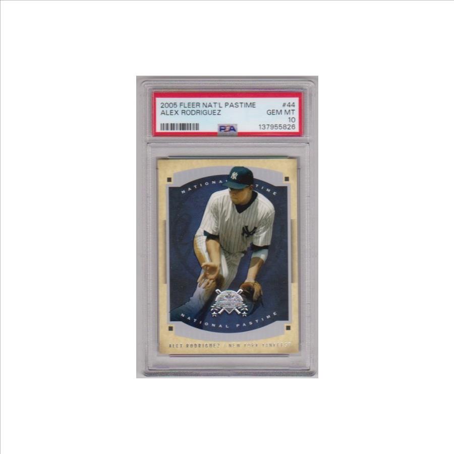 This is a Alex Rodriguez 2005 Fleer National Pastime #44 card that has been graded a Gem Mint 10 by PSA. The holder has some light surface wear, but overall this is a sharp PSA graded card of this retired baseball star.