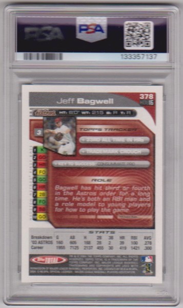This is a Jeff Bagwell 2004 Topps Total #378 card that has been graded a Gem Mint 10 by PSA. There is a small scuff on the front of the holder, but overall this is a sharp PSA graded card of this Baseball Hall Of Famer.