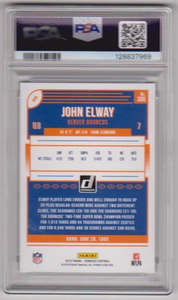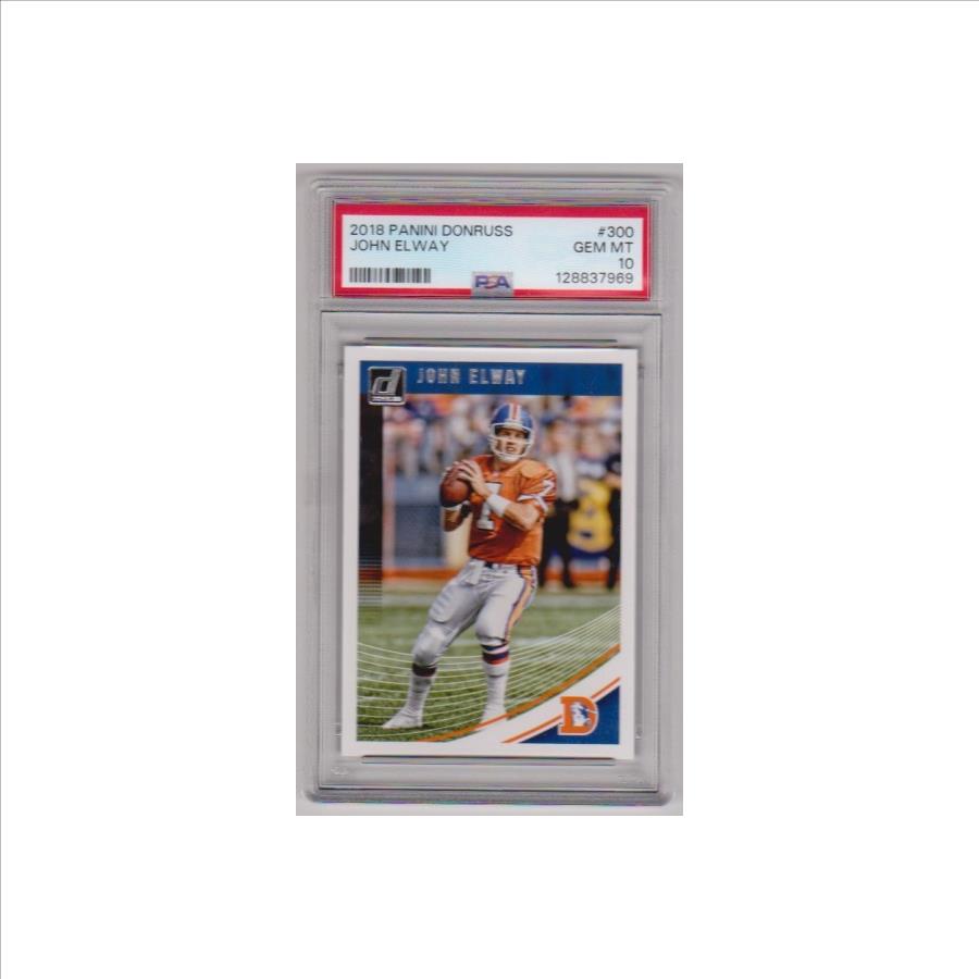 This is an John Elway 2018 Donruss #300 card that has been graded a Gem Mint 10 by PSA. The holder has a light surface scuff on the front, but overall this is a sharp PSA graded card of this NFL Hall Of Famer.