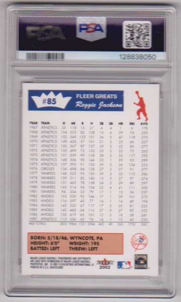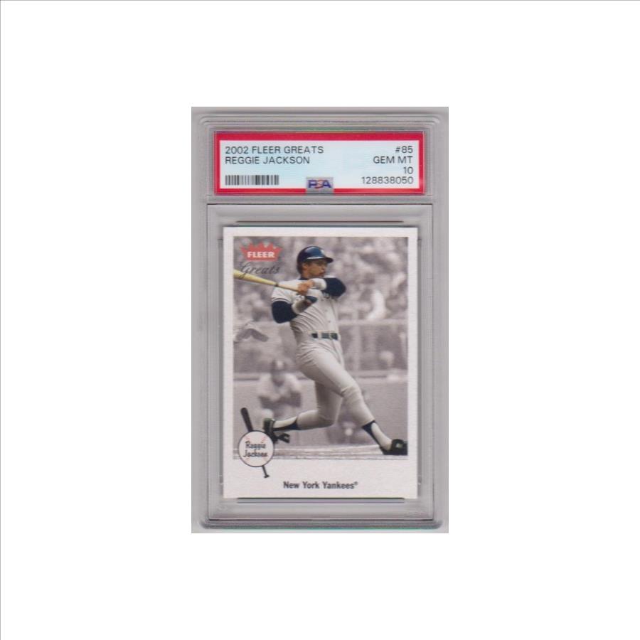 This is a Reggie Jackson 2002 Fleer Greats #85 card that has been graded a Gem Mint 10 by PSA. The holder has some very light surface wear, but overall this is a sharp PSA graded card of this Baseball Hall Of Famer.