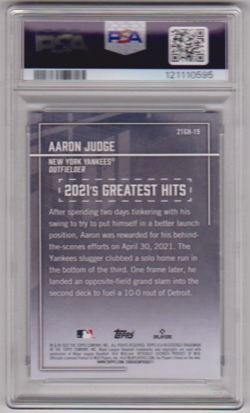This is a Aaron Judge 2022 Topps 2021's Greatest Hits #21GH-19 Insert card that has been graded a Mint 9 by PSA. The holder has some light surface wear, but overall this is a sharp PSA graded card of this baseball star.