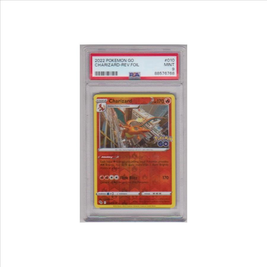 This is a Charizard 2022 Pokemon Go REVERSE HOLO #010/078 card that has been graded Mint 9 by PSA. The holder has some very minor surface wear, but overall this is a sharp PSA graded Charizard card.
