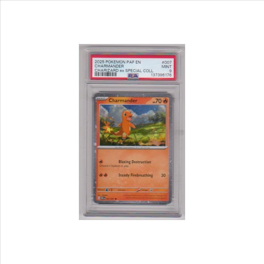 This is a Charmander 2025 Pokemon Paldean Fates EN Charizard EX Special Collection #007 card that has been graded Mint 9 by PSA. The holder has some very light surface wear, but overall this is a sharp PSA graded Charmander card.