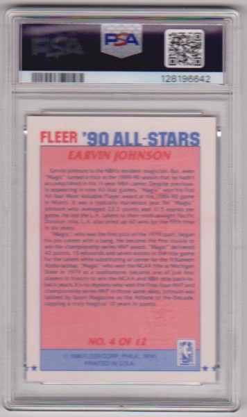 This is a Magic Johnson 1990 Fleer All-Stars #4 card that has been graded a Mint 9 by PSA.  The holder has some minor surface wear, but overall this is a sharp PSA graded card of this NBA Hall of Famer.