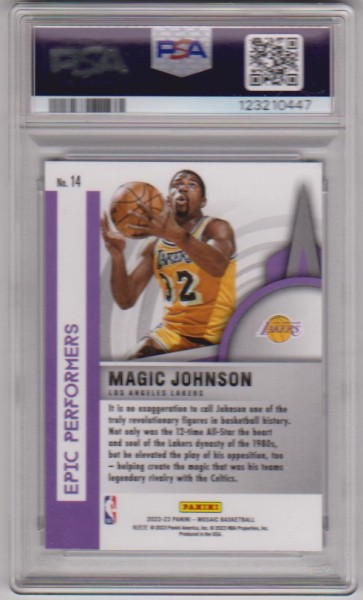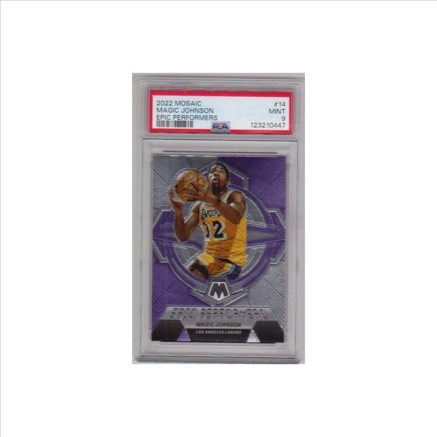 This is a Magic Johnson 2022-23 Panini Mosaic Epic Performers #14 card that has been graded a Mint 9 by PSA.  The holder has some very minor surface wear, but overall this is a sharp PSA graded card of this NBA Hall of Famer.