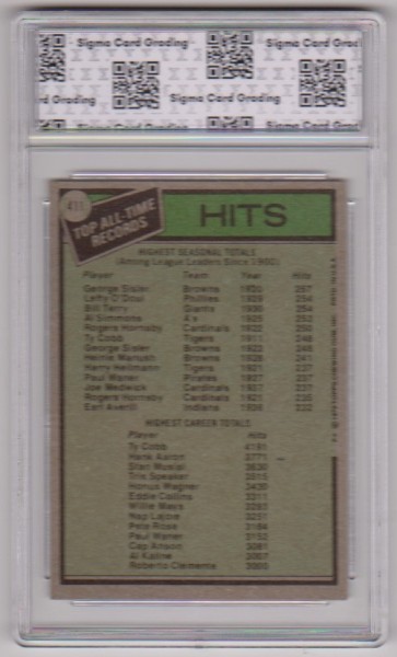 This is a George Sisler/Ty Cobb 1979 Topps All-Time Record Holders #411 card that has been graded a Mint 8.5 by Sigma Grading. The hodler has some light surface wear, but overall this is a nice looking graded card of this pair of baseball Hall Of Famers.