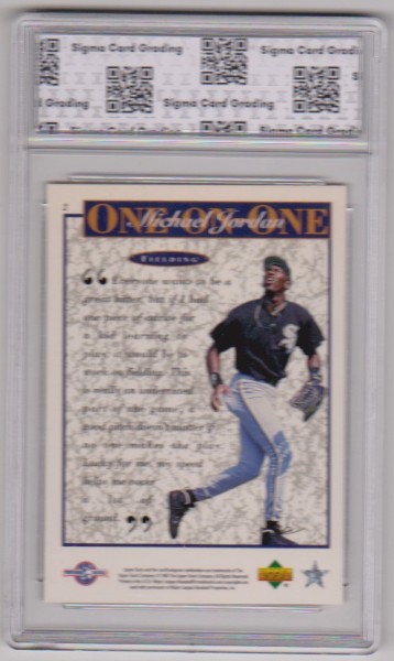 This is a Michael Jordan 1995 Upper Deck Minor League One On One #2 Insert card that has been graded a Gem Mint 10 by Sigma Grading. The holder has some minor surface wear, but overall this is a nice graded Jordan card.