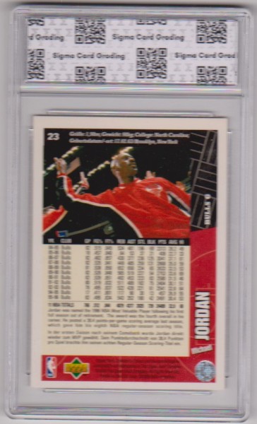 This is a Michael Jordan 1996-97 Collector's Choice German #23 card that has been graded a Gem Mint 10 by Sigma. The holder has some surface wear, but overall this is a nice graded card of this NBA Hall Of Famer.