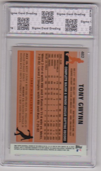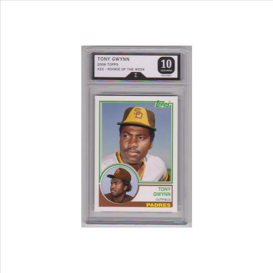 This is a Tony Gwynn 2006 Topps Rookie Of The Week #22 card that has been graded a Gem Mint 10 by Sigma Grading.  The holder has some light surface wear, but overall this is a sharp graded card of this Baseball Hall of Famer.