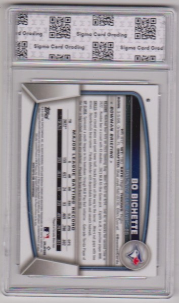 This is a Bo Bichette 2023 Bowman Chrome #6 card that has been graded a Mint 8 by Sigma Grading.  The holder has some surface wear, but overall this is a nice graded card of this baseball star.